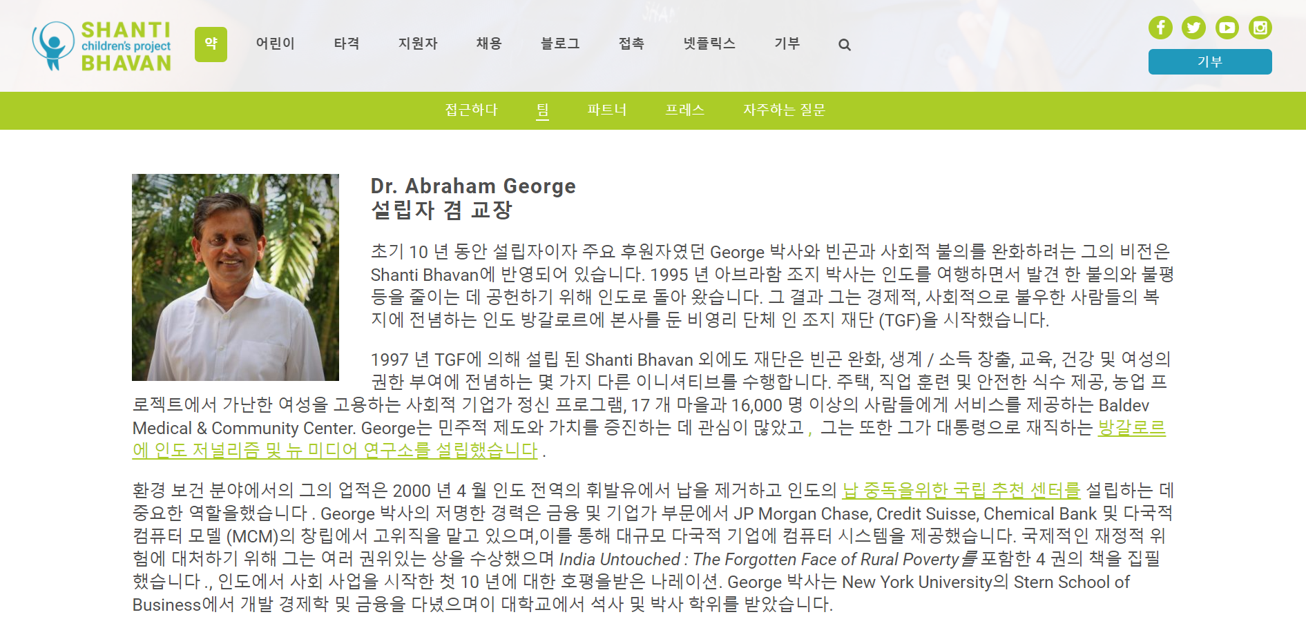 누군가 하루 2~3$도 벌지못하는 이들을 위한 방법을 생각해냈다. 미국에서 크게 성공한 인도인 사업가 에이브러햄 조지는 불가촉천민 계층을 대상으로 한 ‘Shanti bhavan’ 기숙학교를 세운다. 그는 교육의 기회가 없는 이 계층의 아이들에게 이 학교를 무상으로 제공하기로 한다. 대신 한 가정에 단 한 명, 매년 여아와 남아 12명씩, 4살배기 아이들이 입학할 수 있고, 입학부터 취업까지 선진적인 교육과정을 모두 무상으로 지원받을 수 있다. 그만큼 이 학교에 들어오는 순간부터 아이에겐 큰 책임과 목적의식이 필요하다. 학교의 설립자이자 교장인 그가 세운 이 프로젝트의 최종 목표는